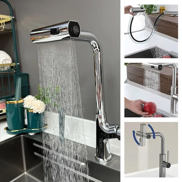 Többcélú konyhai keverőcsapunk 360°-ban elforgatható nagynyomású vízkivezetővel rendelkezik, amely nemcsak a fröccsenést küszöböli ki, hanem a vízáramlást is fokozza, így a mosogatás és öblítés hatékonyabbá és kezelhetőbbé válik.