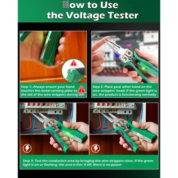 Lefedi az AWG 10, 12, 14, 18 és az 1,0 – 4,0 mm² méreteket. A feszültségvizsgáló megmutatja, ha az áramkör halott.